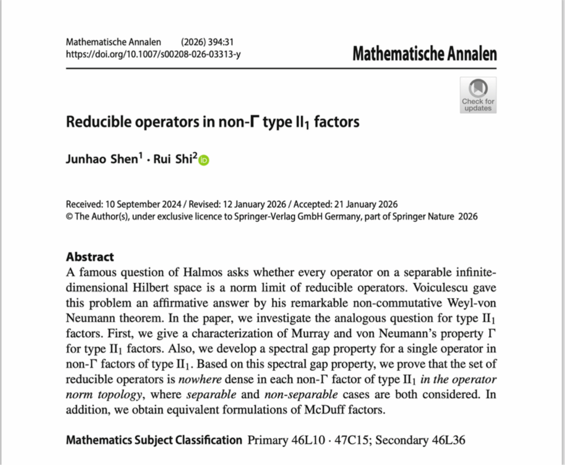 近日,我院石瑞教授与美国新罕布什尔州立大学Junhao Shen教授共同撰写的论文“Reducible operators in non-Gamma type II1 factors”在数学期刊《Mathematische Annalen》正式发表。 该期刊自1868年创刊以来,始终致力于发表高质量的数学研究论文,历任编辑包括Felix Klein、David Hilbert、Albert Einstein等数学与物理学巨匠。