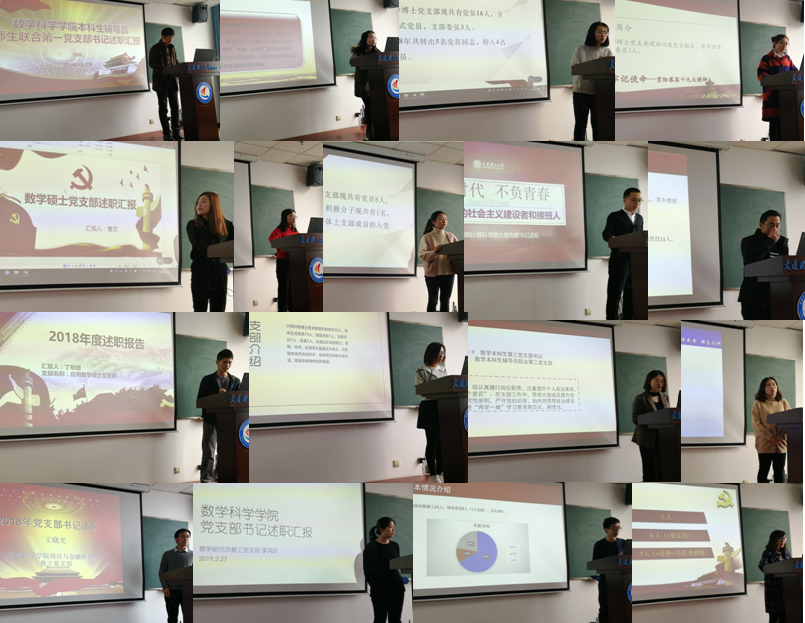 2月27日上午,数学科学学院党委在创新园大厦14楼会议室召开了2018年度基层党支部书记述职大会,学院党委副书记于化东、研究生党总支书记崔弘扬、所有师生党支部书记及部分支委等参加了本次会议,会议由学院党委组织员张静主持。