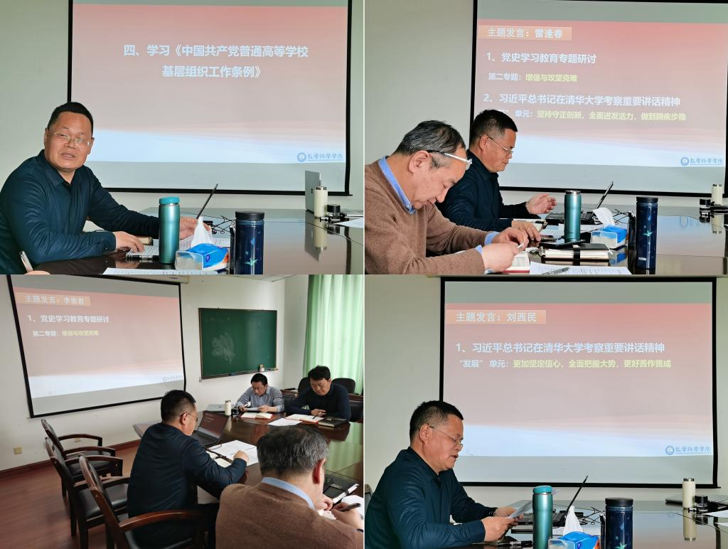 学院党委书记刘西民全面传达了习近平总书记在清华大学考察重要讲话精神,要求领导班子成员要深刻领会此次讲话精神的丰富内涵和重大意义,进一步增强“干实事”“解难事”“谋大事”“创新事”“长本事”的思想自觉和行动自觉。随后,他带领大家集体学习了《中国共产党普通高等学校基层组织工作条例》。