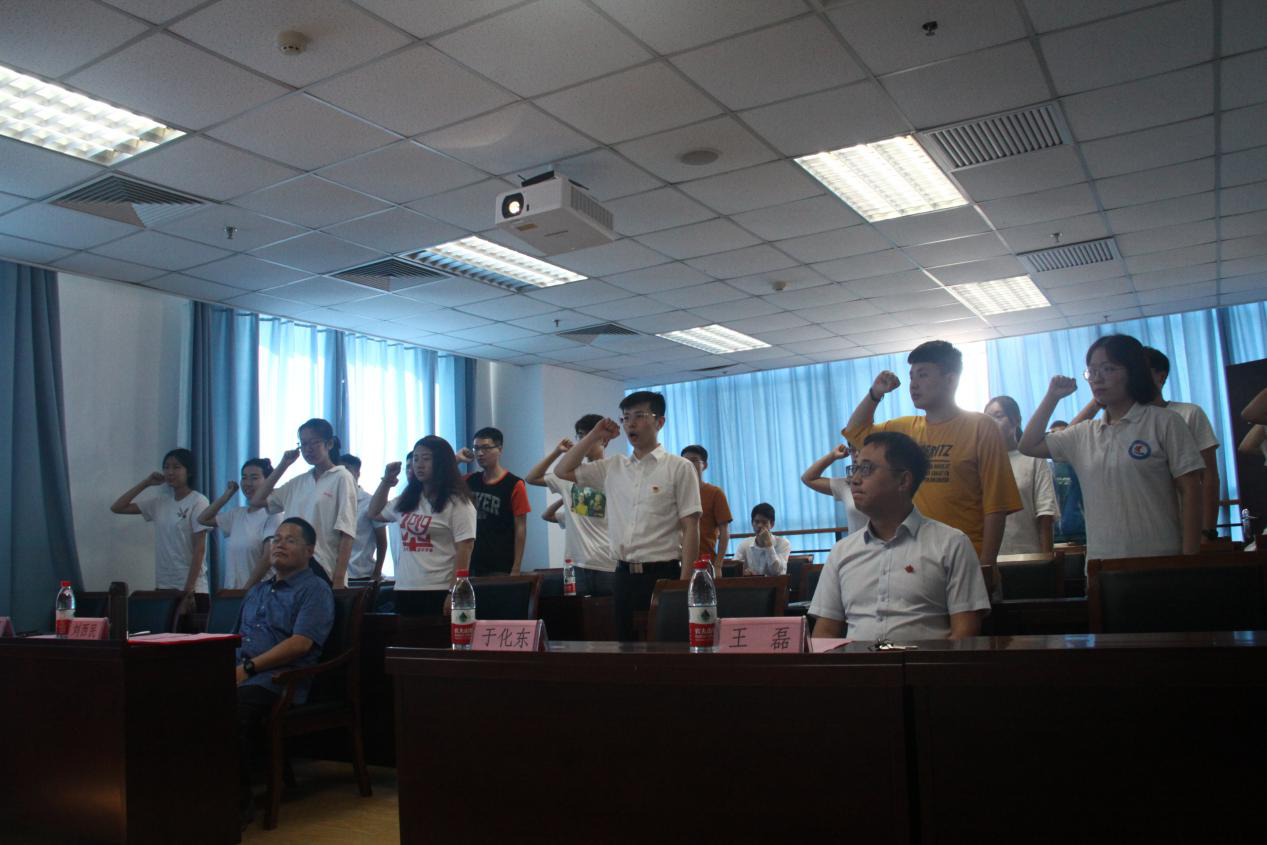 首先,于化东对出席大会的领导和嘉宾作了介绍。随后,研究生辅导员崔弘扬宣读预备党员名单并带领新党员宣誓。面对着鲜艳的党旗,全体新党员举起右手,面向党旗庄严宣誓。一字一句,铿锵有力,全体党员接受了一次精神上的教育和洗礼,进一步坚定了立场信念。