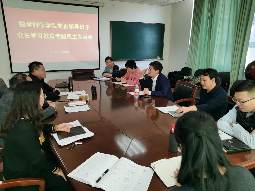 1月4日下午,按照学校党委的统一部署,数学科学学院领导班子召开党史学习教育专题民主生活会,学校党委常委、统战部部长董国海出席会议,人文与社会科学学部党委副书记兼副部长、纪委书记陈家晶列席督导。会议由数学科学学院党委书记刘西民主持。