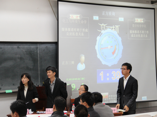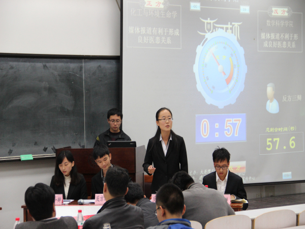本次辩论赛的议题是“媒体报道有利/不利于形成良好的医患关系”,数学科学学院代表队持反方观点。在开篇立论环节,正方先就什么是良好的医患关系提出其并不只是情感上的认同,更是一种具有社会性质的观点,后以举例说明媒体报道可以起到对医疗制度的完善与推动作用;而反方则从数据出发,指出媒体报道存在夸大事实的现象,从而提出媒体报道不利于形成良好的医患关系的观点。在驳论环节,双方二辩的表现都十分出色,使比赛达到了一个小高潮。经过了攻辩盘问环节后,就是精彩的自由辩论环节,双方你来我往,针锋相对,比赛进入高潮。最后,辩论赛在双方四辩总结之后结束。