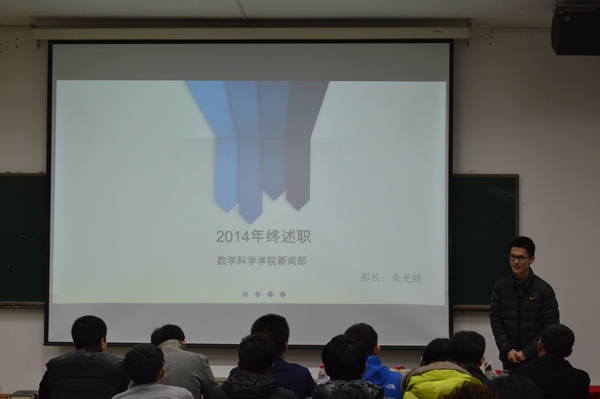 为加强团委学生会队伍建设,总结梳理2014年度团学工作,,数学科学学院于1月5日下午在建馆205室举行团委学生会年终述职答辩暨“两优一先”评选答辩会。学院党委副书记兼副院长马吉祥老师、党委组织员兼学办主任冷鸿涛老师及各年级辅导员作为评审嘉宾出席了此次大会。同时,由团委学生会各部门副部长及“两优一先”参评同学担任学生大众评委,保证此次大会的公平公正。