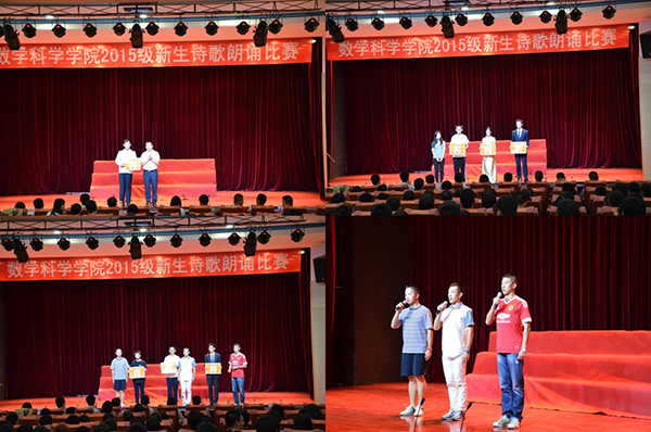9月13日晚,数学科学学院2015级新生诗歌朗诵比赛在综合二号楼B301举行。学院党委副书记兼副院长孙壮、党委组织员兼学办主任2014级辅导员冷鸿涛、1502班班主任刘浏、1504班班主任房祥东及学生工作办公室全体老师出席本次活动。