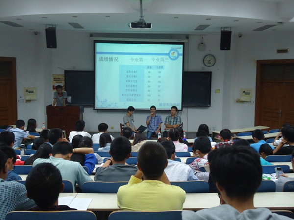 第二部分由数学科学学院杰出的学长们与新生进行交流,传承优秀的经验。大三学霸项敏同学和马晨阳同学与新生分享学习心得,而在科创方面屡屡获奖的大神邸宏鸣同学向大家介绍了经验,团学工作十分出色的翟彤阳同学则和大家交流了大学中的社会工作。通过交流,激励同学们努力学习,完善自我,健康成长成才。
