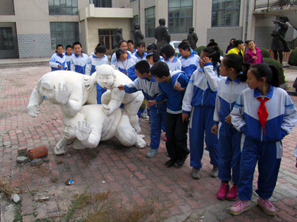走出校史馆,一行人路过七七足球场、山上礼堂、综合一号楼,来到了建筑艺术学院,这里摆放着着许多大工学子的作品,老师还指着其中的某些雕塑对小朋友们进行提问,帮助孩子们更好地了解艺术、感受艺术。