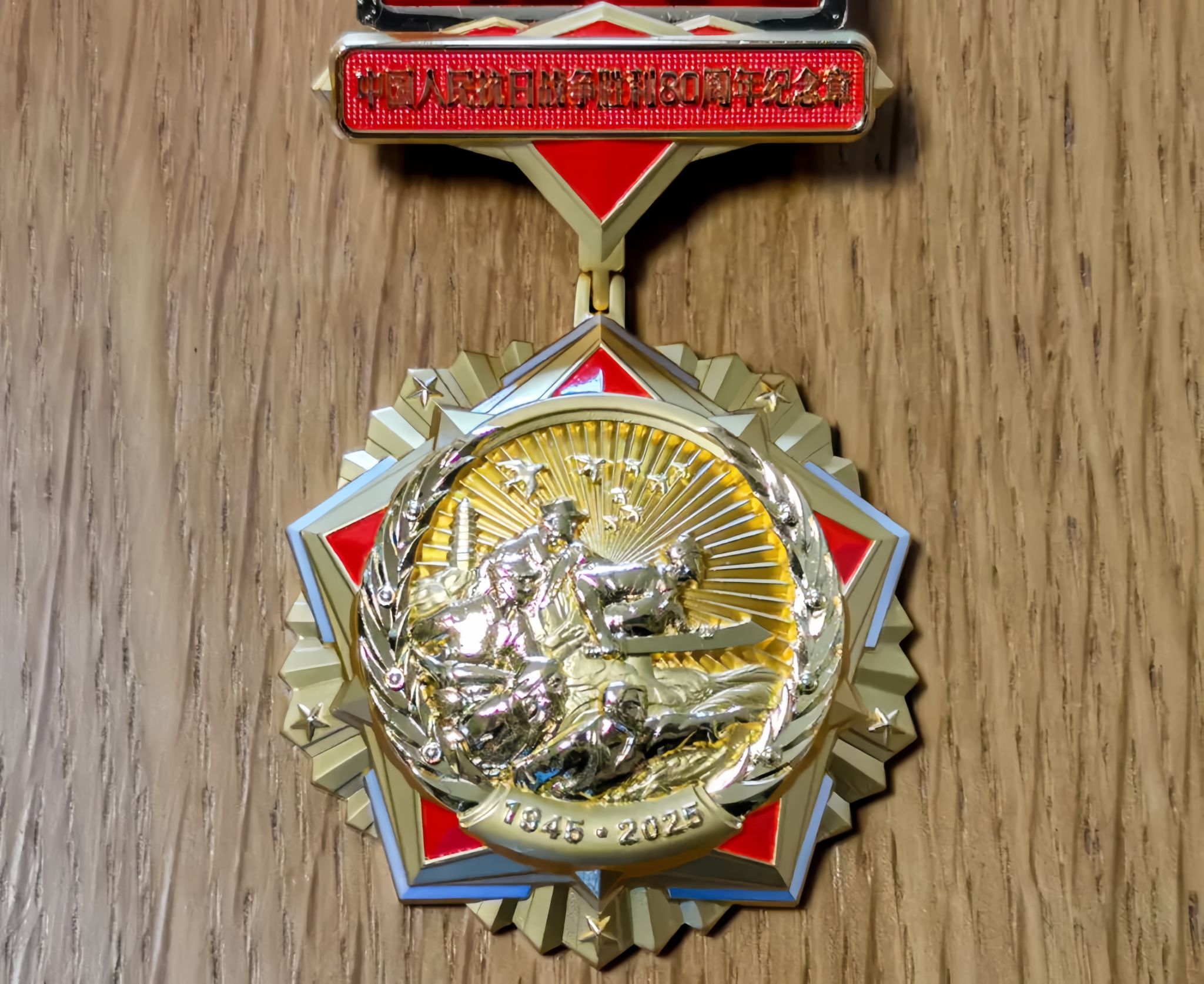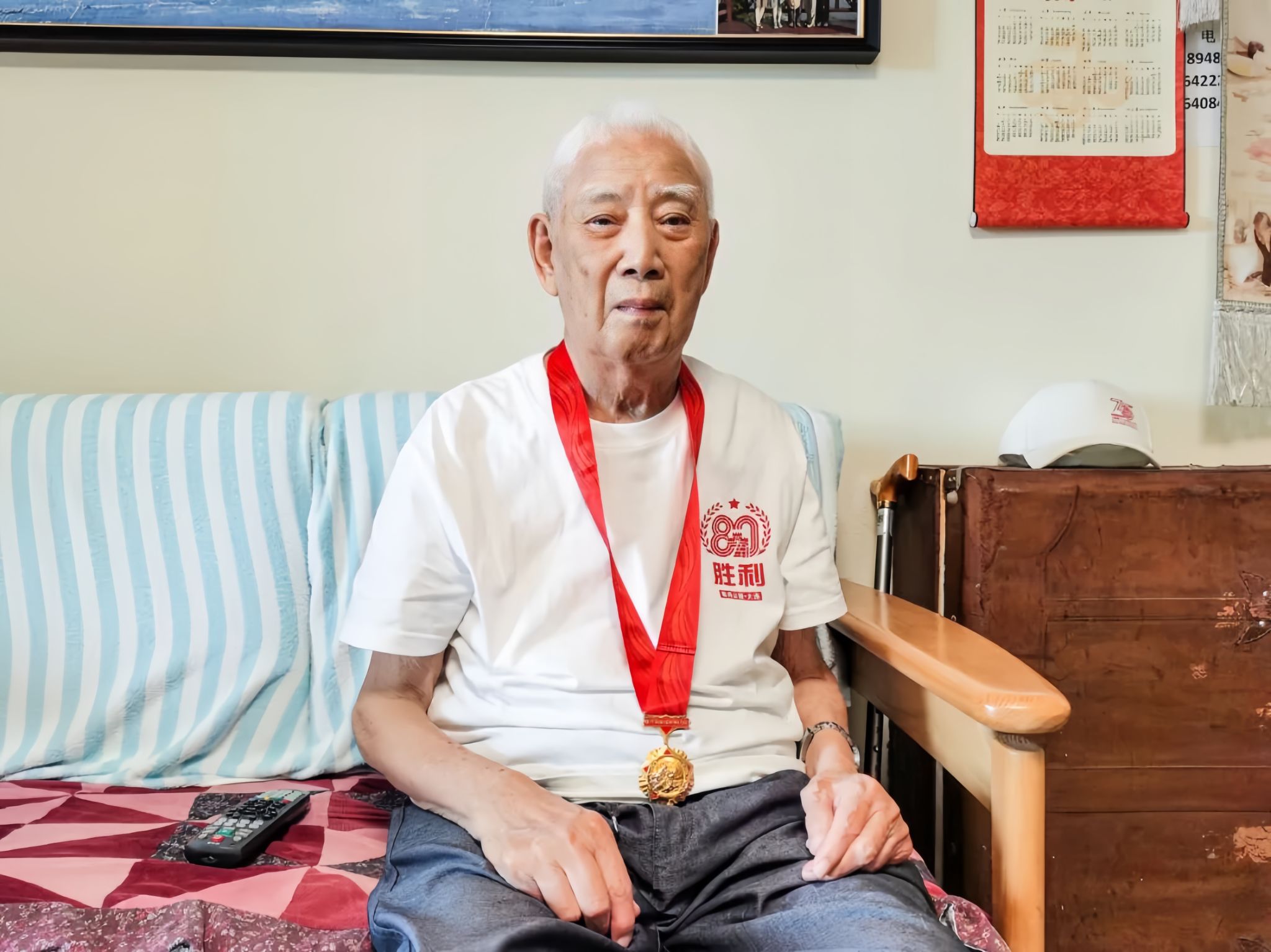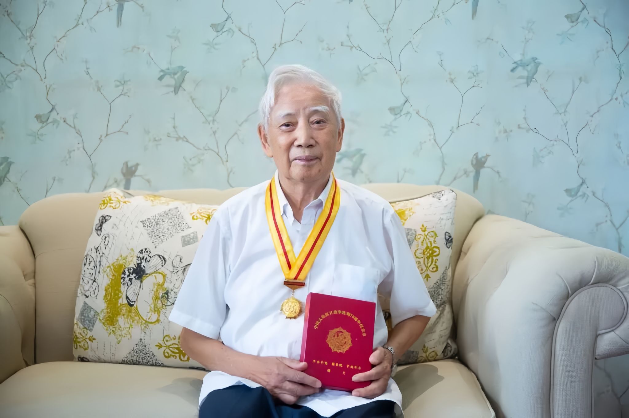 2022年8月,100岁的张义燊教授与“中国人民抗日战争胜利70周年”纪念章合影