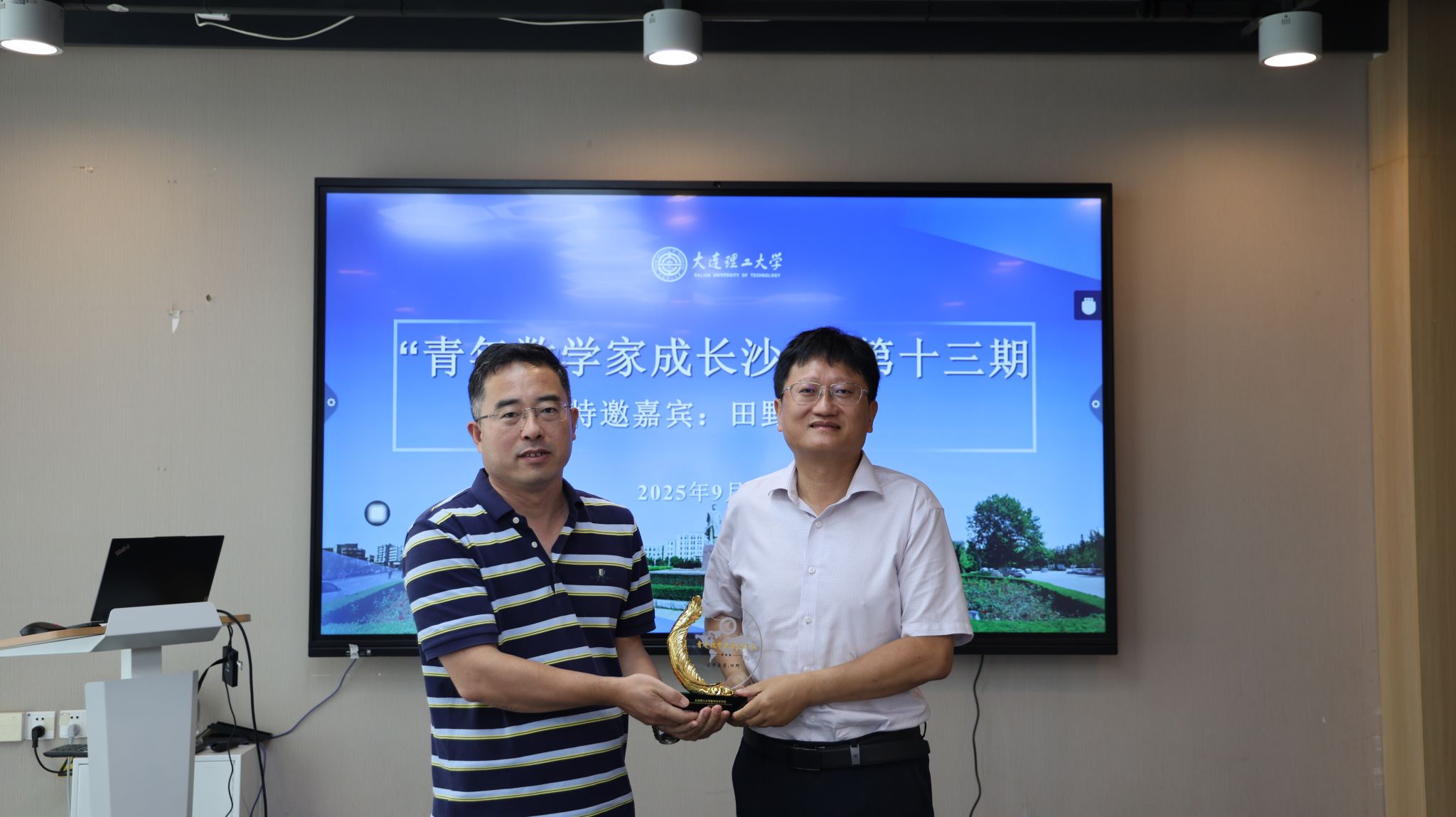沙龙在轻松融洽的交流氛围中展开。青年教师们踊跃向田野院士请教自己在学术科研和成长发展道路上遇到的困惑,田野仔细聆听,并逐一解答。田野鼓励青年教师要尽量规划出整块的思考时间,以便集中精力攻克科研中的重要问题,避免时间零散化。同时,也要重视基础问题,聚焦问题本质,与时俱进地关注学科发展趋势。他建议保持经常性的学术交流有助于高效率的在跨领域合作上寻找到学科交叉火花。会上,柳振鑫为田野院士赠送了大连理工大学“青年数学家成长沙龙”的纪念牌。