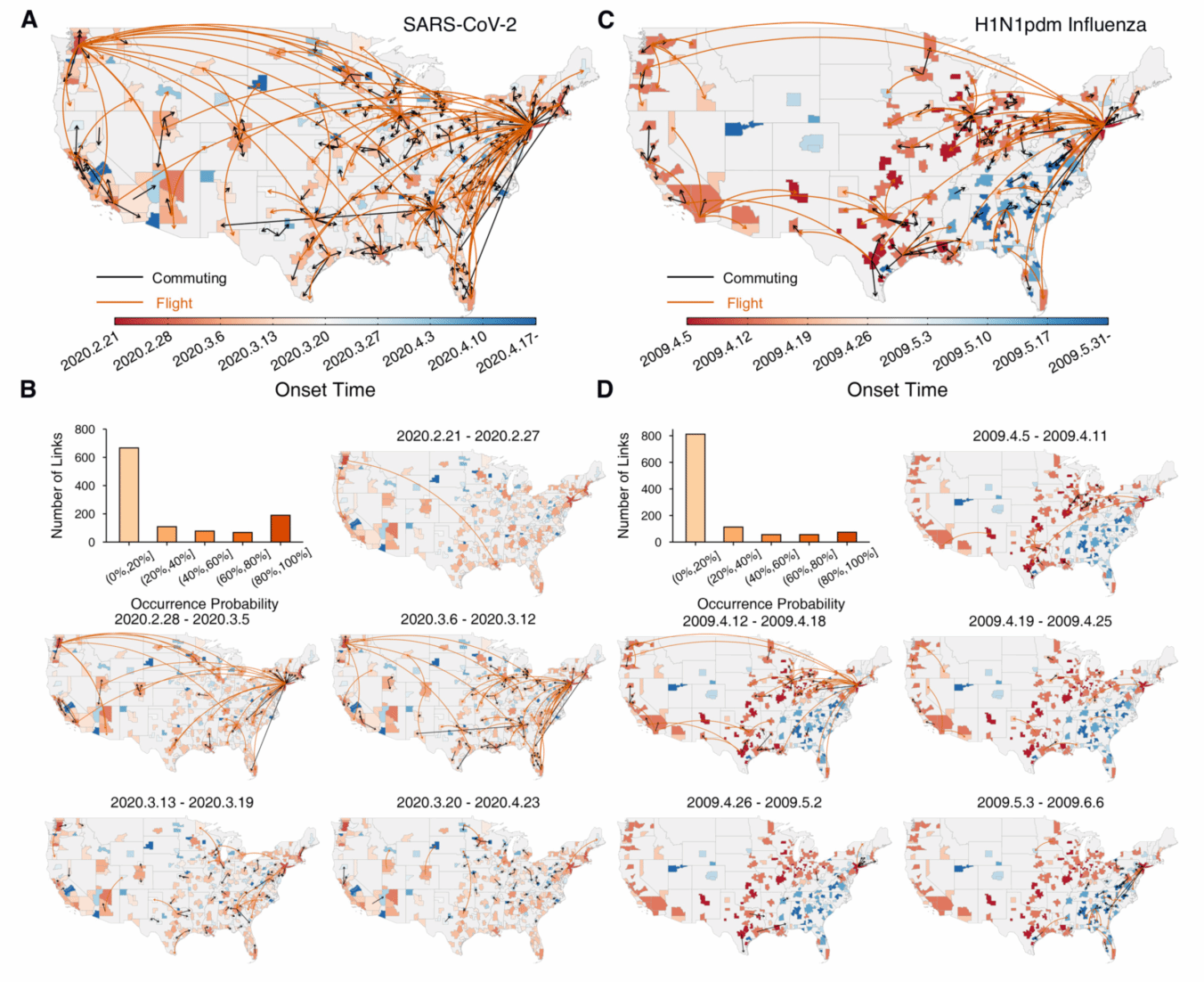 近日,由大连理工大学、哥伦比亚大学、普林斯顿大学等机构联合开展的一项研究取得重要突破,研究团队成功构建全新的贝叶斯推断框架,系统重建了2009年H1N1流感病毒与2020年SARS-CoV-2病毒在美国大都市区(MSA)的早期空间传播网络结构。该研究首次揭示了两种病毒传播路径的差异性,同时明确了两者均在数周内通过航空旅行快速扩散至全美大部分地区的关键规律,为未来呼吸道病毒大流行的早期监测、预警与防控提供了重要科学依据。