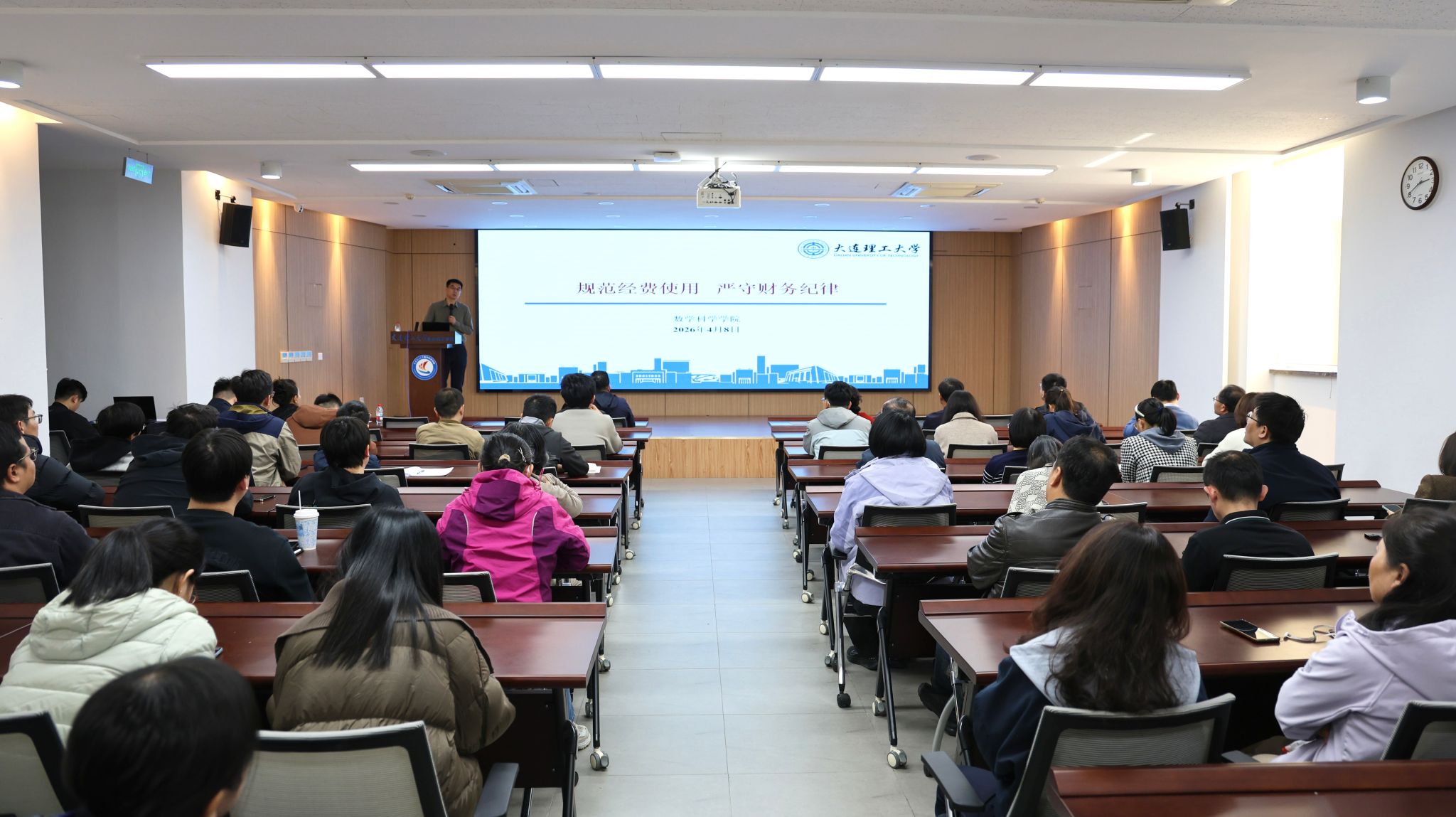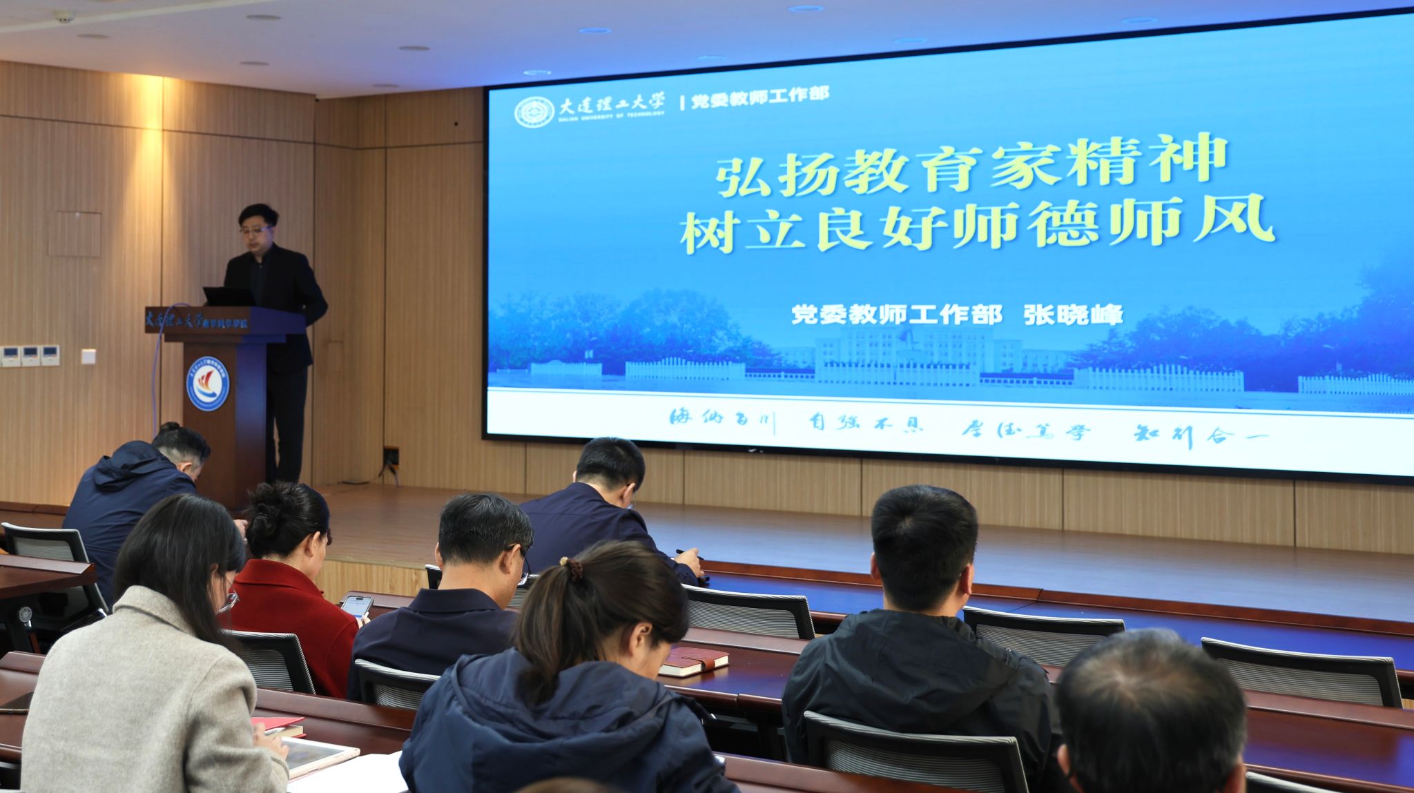 张晓峰围绕师德师风建设主题开展系统讲解,从“高位引领看背景、底线思维知敬畏、见贤思齐学榜样、保驾护航促发展”四个方面,为全体教师厘清建设要求与行动方向。其间,他重点解读国家师德师风相关制度文件,明确师德师风作为教师评价首要标准的刚性要求;结合校内外多起师德失范典型案例,深入剖析政治纪律、廉洁从教等领域的红线底线;介绍师德师风建设先进典型事迹,并解读学校规章制度及专题教育等系列工作安排。张晓峰强调,师德师风建设是教师的终身修行,呼吁全体教师严守职业底线,对标先进典型,将教育家精神内化于心、外化于行。