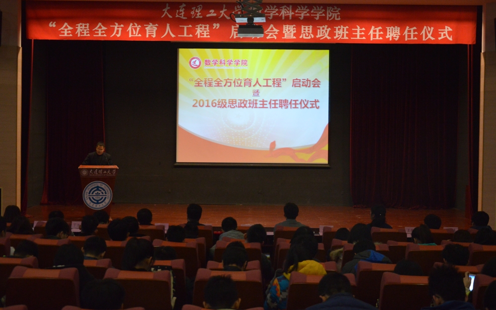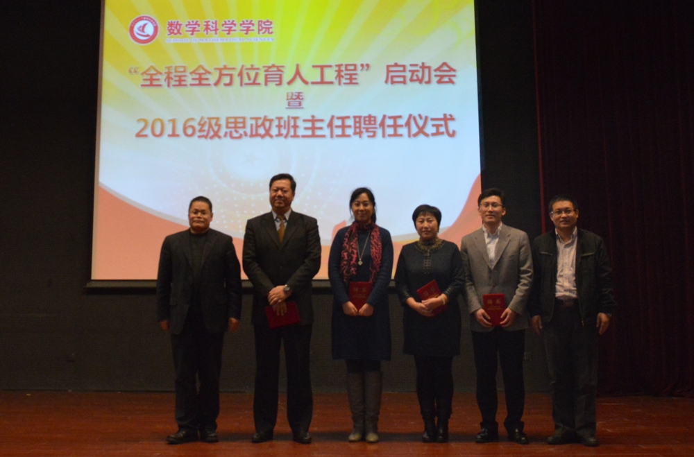 为深入贯彻全国高校思想政治工作会议精神和落实学校党委部署要求,12月21日下午,数学科学学院党委在百川报告厅举行“全程全方位育人工程”启动会暨2016级本科生思政班主任聘任仪式。校党委宣传部常务副部长、新闻中心主任、马克思主义学院党总支书记周福战、校团委书记陆凯、校学生工作处副处长顾丰、学院党委书记刘西民、学院副书记兼副院长孙壮与学院各位思政班主任、专业班主任和辅导员一同参加会议。会议由学院党委组织员兼学办主任冷鸿涛主持。