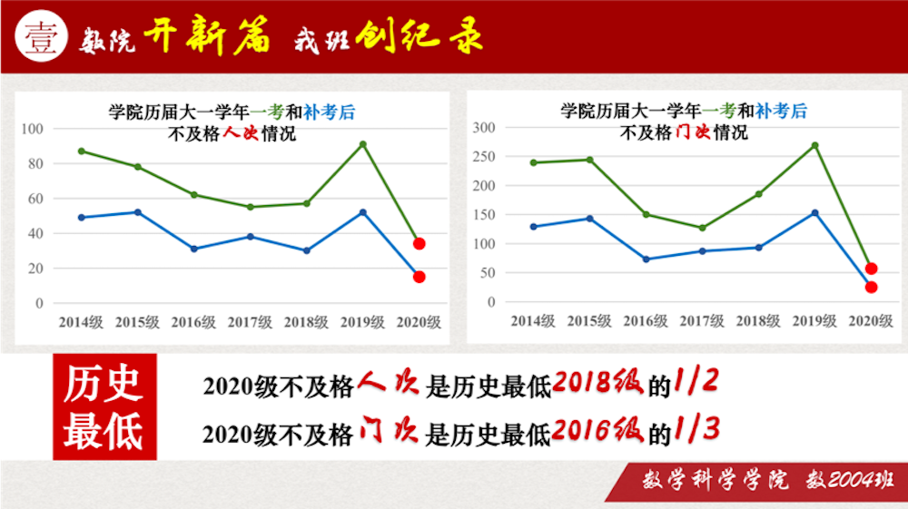 对比学院历届大一同期一考和补考后的不及格情况,2020级是历史最低。而在全年级的6个班中,数2004班在平均分、英语四六级通过率、获奖情况等都处于年级第一,是学院首个零挂科、首个在大一全部通过四级的班级。