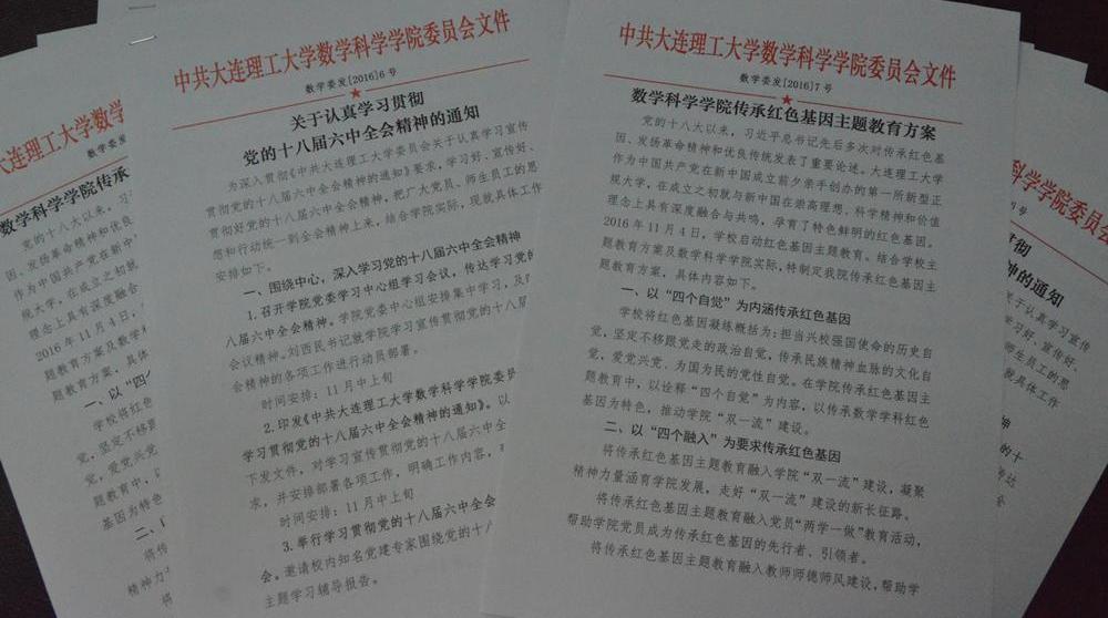 针对学院传承红色基因主题教育工作,刘西民书记提出:学院全体党员以“四个自觉”为内涵传承红色基因,以“四个融入”为要求传承红色基因,以“八项活动”为载体传承红色基因,做数学红色基因的发掘者、记录者、见证者、践行者和传承者,为大工的红色基因传承做出数学人的贡献!