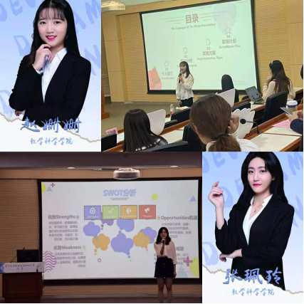 赛场上,来自数硕2001班的赵姗姗同学志愿成为一名高中教导主任。她从各个角度充分了解教导主任这个职业的就业前景,并通过丰富的实习经历,对照之前的职业认知,确定自己确实适合这一行业和工作环境。进而结合自身实际有针对性地合理规划研究生期间的学习、生活与实践。来自数1806班的张珮玲同学以《想做金融的数学人》为主题,讲解了自己对于金融行业的认知,从职业规划思路、自我认知与分析、职业决策、计划与路径、评估与调整五个方面对自身的职业生涯规划进行展示。经过精彩的答辩展示和问答环节,最终赵姗姗同学取得了大赛研究生组一等奖,张珮玲同学取得了大赛本科组二等奖的优异成绩。