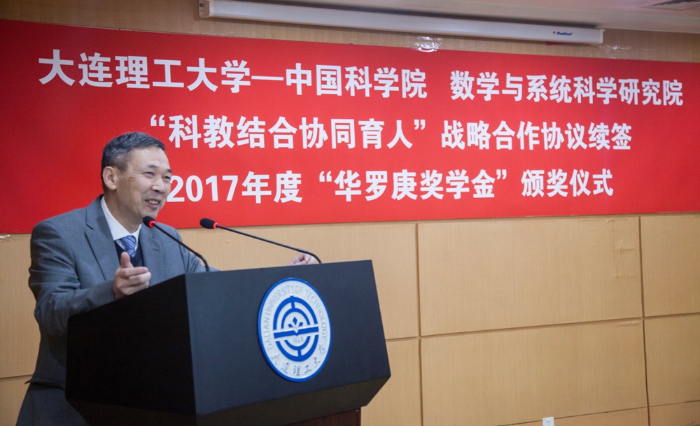 郭东明校长在致辞中感谢中科院数学与系统科学研究院和华罗庚先生家属长期对我校“华罗庚班”建设给予的大力支持。表示,自2012年8月签定“科教结合协同育人”战略合作协议以来,双方在学科建设、教学科研、学生培养等方面取得了明显成效。尤其是自2013年起联合创办的“华罗庚班”,在拔尖创新人才培养上取得了可喜成绩。“华罗庚班”汇聚了双方的优势教研资源,经过双方的通力合作,因材施教的小班制和循序渐进的“三加一”培养机制收效显著。希望双方进一步推进合作,把“华罗庚班”办好,把我校数学学科建设成为在国内外具有重要地位的一流学科。