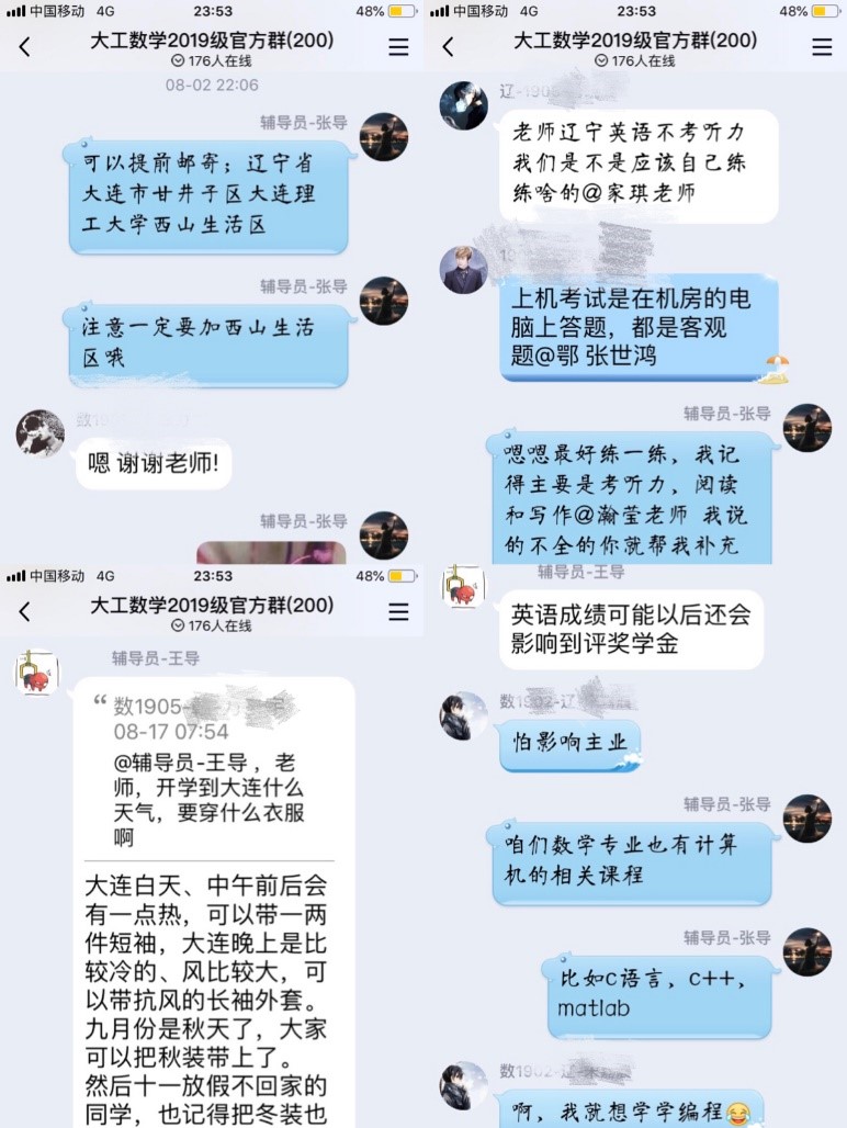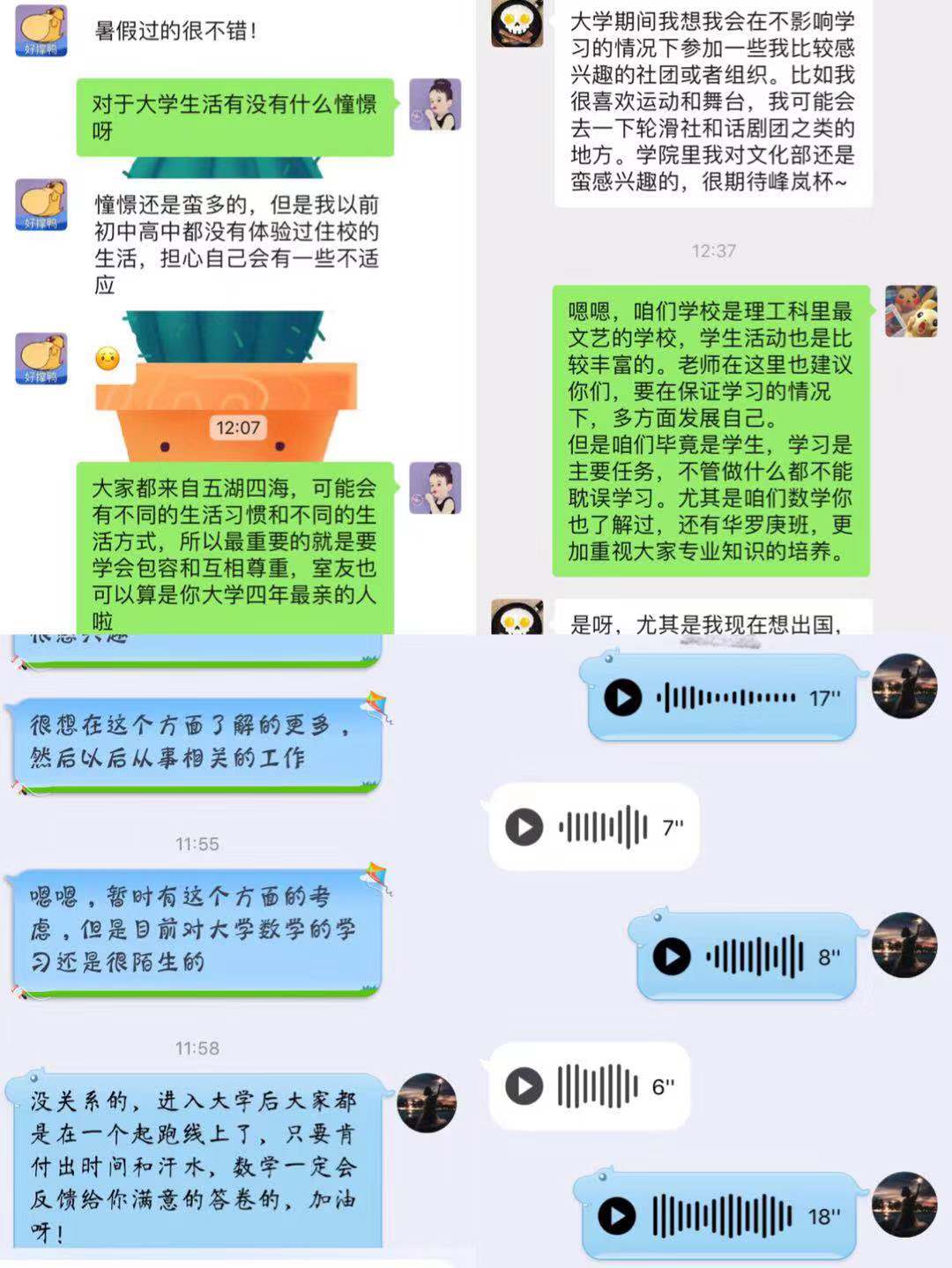 同时,新生辅导员利用暑假通过音视频网络聊天完成了对全体新生的一对一春雨谈心,人均谈心时长近两小时。从高考报考了解学生们的专业兴趣和专业基础;到家长里短了解学生们的性格特点,帮助家庭经济困难学生了解国家和学校的资助政策;再到青春梦想,将职业规划工作前置。让辅导员在新生入学前即成为学生的知心朋友。“报到时与新生一见如故”是数学科学学院所有新生辅导员老师们对自己提出的要求。”