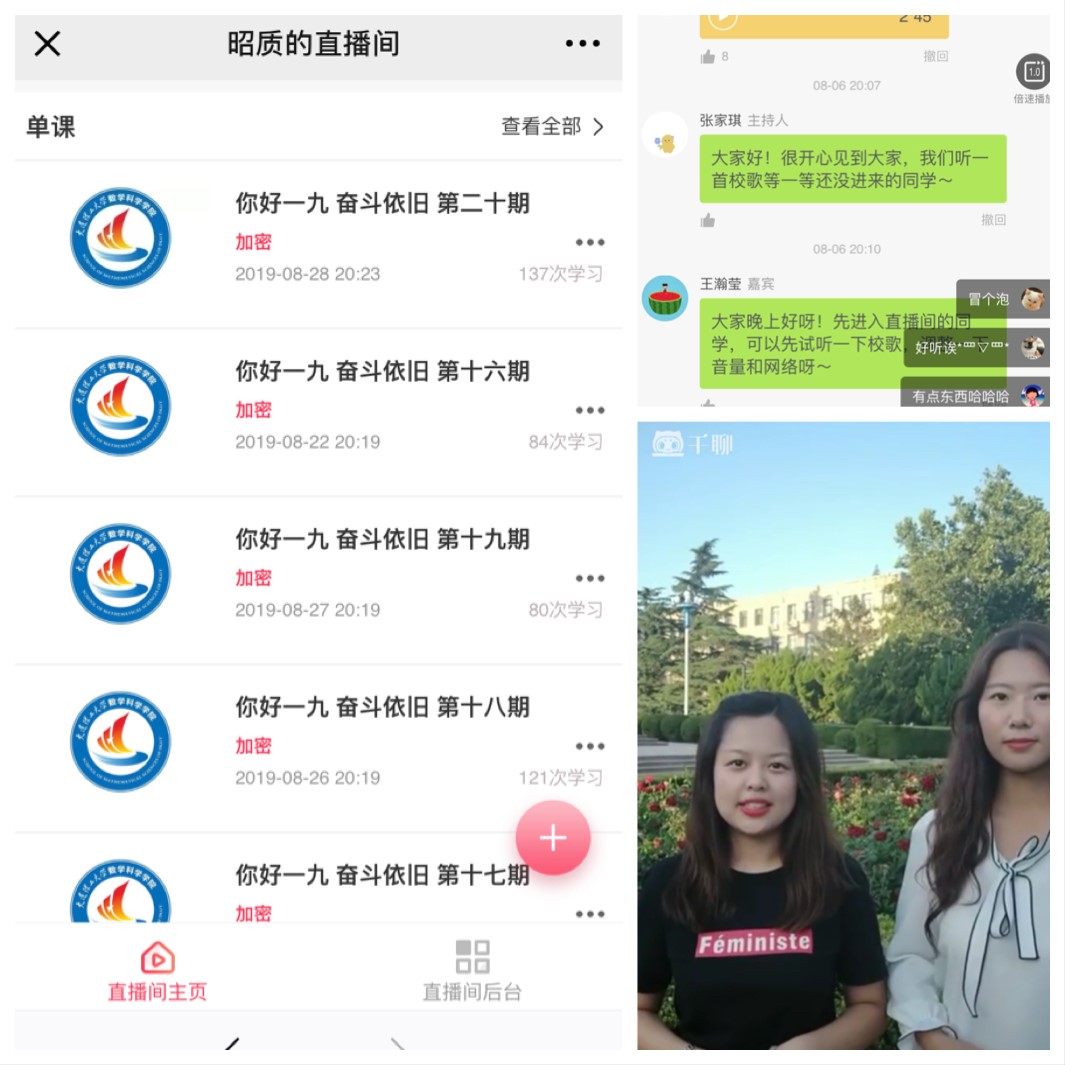 暑假期间,辅导员每晚20:19推出以“你好一九,奋斗依旧”为主题的系列直播20期,累计时长30余小时,万余人次参与。辅导员们精心设计直播内容,引导2019级新生更好更快的适应大学生活。00后新生们在每天晚上都会在群里等着直播的开始,戏称:如果今天不听直播总感觉自己的这一天不完整。