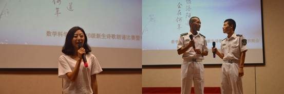 新生导员马铭老师亲切致辞,让我们感受到了她对学生的亲切和关怀。相遇即是一种幸运,她愿与同学们一起奋斗一起度过充实愉快的大学生活,共同书写一段珍贵的回忆。教官们为同学们深情演唱了《传奇》,只是因为在人群中多看了你一眼,我们缘分就不再改变。“数学有你更精彩!”数学科学学院大家庭欢迎新成员的加入,我们将会努力为每个人带去感动。
