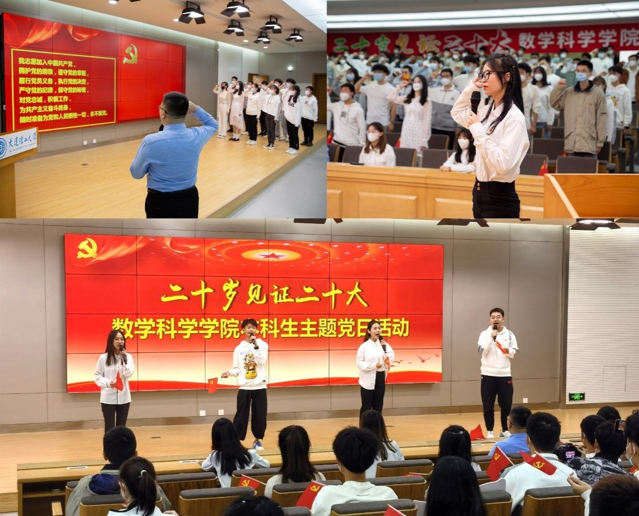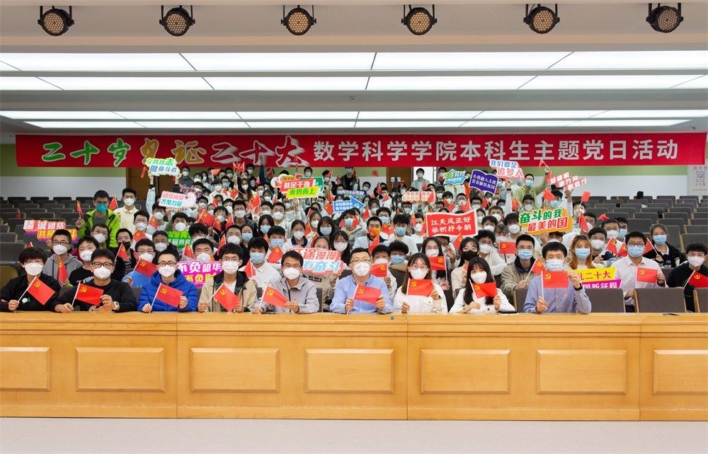 10月16日,中国共产党第二十次全国代表大会正式开幕,在开幕会开始之前,数学科学学院举办“二十岁见证二十大”本科生主题党日活动,邀请学院年满20周岁的同学作为嘉宾,共同见证党的二十大胜利开幕,同时也是一场特别的集体生日会。学院本科生辅导员纵向党支部全体师生党员共同观礼。