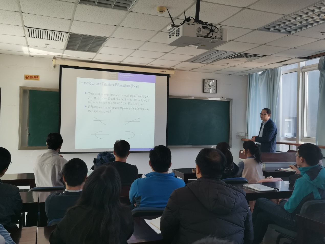 会上,衣凤岐、李俊峰两位老师先后介绍了自己的科研方向和研究兴趣,并对一些相关问题进行讨论和交流。衣凤岐老师先从无穷维动力系统的稳态分支和Hopf分支讲起,向大家介绍了该领域的研究进展,并简要介绍了他和合作者在该领域所开展的一些研究工作;随后,向大家介绍了分支理论在图灵斑图的形成机制研究及传染病传播问题研究中的具体应用。李俊峰老师介绍了他和他的合作者应用调和分析方法研究非线性色散方程、沿曲线的奇异积分理论以及色散算子点态收敛的Carleson问题的一些成果。通过这些结果的介绍,李老师阐述了调和分析中震荡积分估计在这些问题研究中的重要性。同时还阐释了研究过程中研究者的视角对于问题理解的重要意义。
