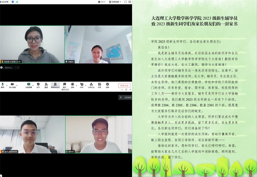 新生辅导员利用暑假,完成了与全体新生的一对一网上春雨谈心,人均谈心时长一小时,为每一名新生精准画像,致新生和家长一封家书做好入学温馨提示,走心用心、遇“新”育“新”。一位今夏到某省区招生的老师请我们关爱一位他招进的家庭经济困难学生,但没说学生姓名,辅导员根据省区脱口而出学生名字,经核实准确无误,充分验证了谈心成效;学院连续第八年为每名新生匹配同生源地的一对一生活向导,让新生能听着“乡音”入学,继续传承“你迎我入学、我送你毕业”的迎新、毕业文化联动机制。从年级群、级队群,再到班级群、生活向导群,辅导员共建立213个QQ群,整理90条Q&A为新生答疑解惑,为新数苗入学排除所有困难。