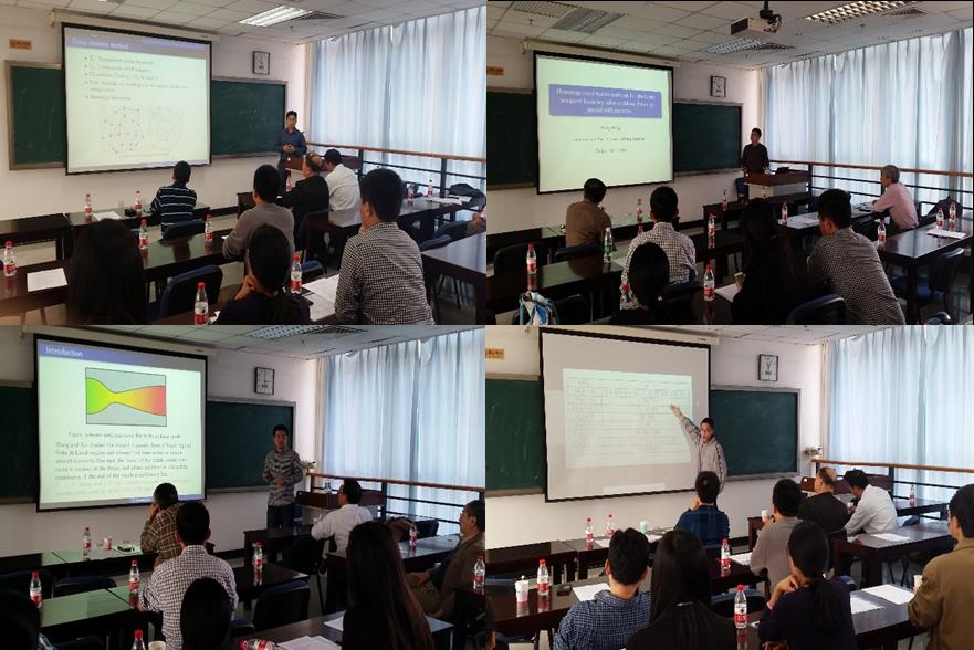本次学术报告会上,双方报告人为师生们奉献了10场精彩的学术报告,共分为四小节,分别由李崇君副院长、邹永魁副院长、雷逢春副院长和王德辉副院长主持。各报告人依次介绍了他们的科研进展情况。吉林大学邹永魁教授、张凯老师、窦全杰老师、张一木老师、李聪老师、王鹏副教授、聂元元老师分别做了题为《Finite Element Methods Analysis for the Stochastic Cahn-Hilliard-Cook Equation》、《Numerical method for stochastic interface grating problem》、《The $q$-log-convexity of Domb's polynomials》、《S^3中曲面的对称》、《A class of operators in the hyperfinite type II1 factor》、《Homotopy continuation methods for stochastic two-point boundary value problems driven by special additive noise》、《TBA》的学术报告。我校数学科学学院孟兆良副教授、李风玲副教授、牛一老师分别做了题为《A stable nonconforming finite element on hexahedra》、《Invariants of 3-manifolds from Heegaard splittings》、《A new estimating equation approach for marginal hazard ratio estimation》的学术报告。参会老师从科学问题、交叉合作、应用研究到新的学科生长点的创建等多方面与报告人进行了深入的研讨。