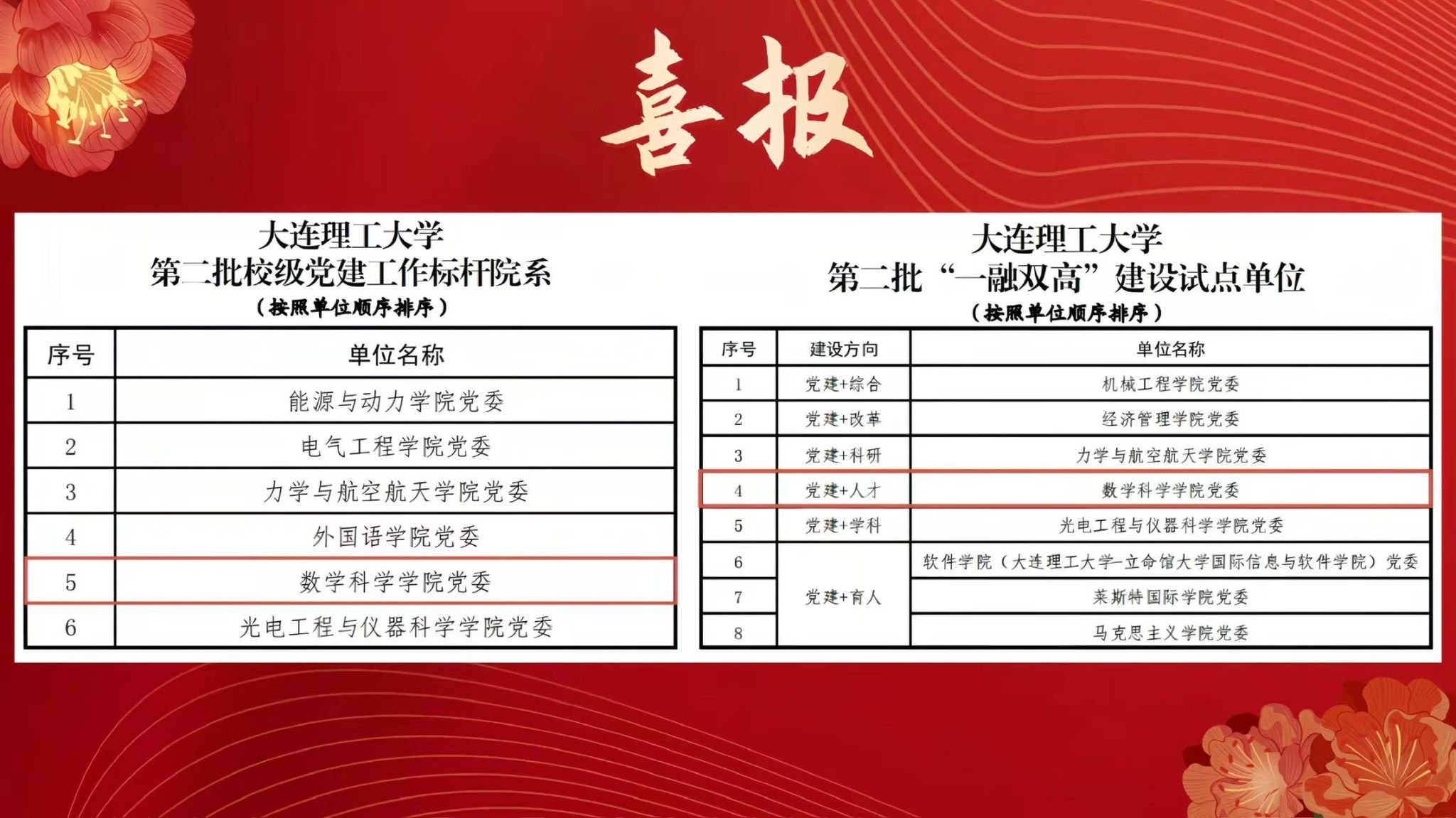 近日,学校党委组织部公布了大连理工大学第二批党建工作标杆院系、“一融双高”建设试点单位、党建工作样板支部和“一融双高”特色党支部评选结果。数学科学学院党委获评党建工作标杆院系和“一融双高”建设试点单位(建设方向:党建+人才);应用数学研究所教工党支部获评党建工作样板支部;低年级本科生师生纵向党支部、应用数学研究所教工党支部获评“一融双高”特色党支部共计5项荣誉。