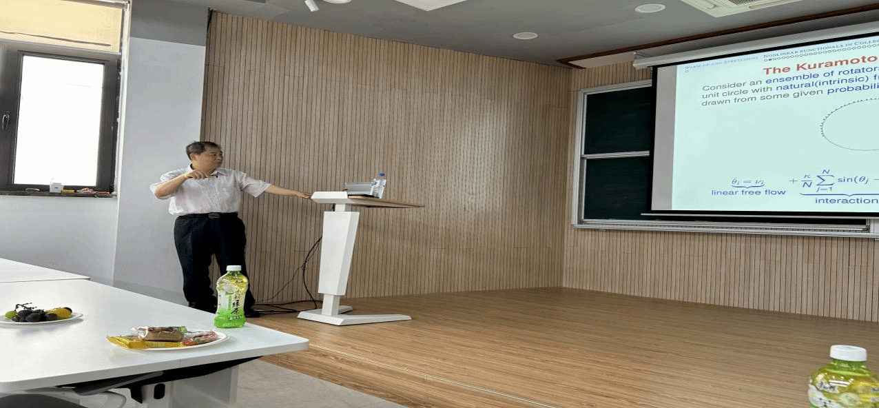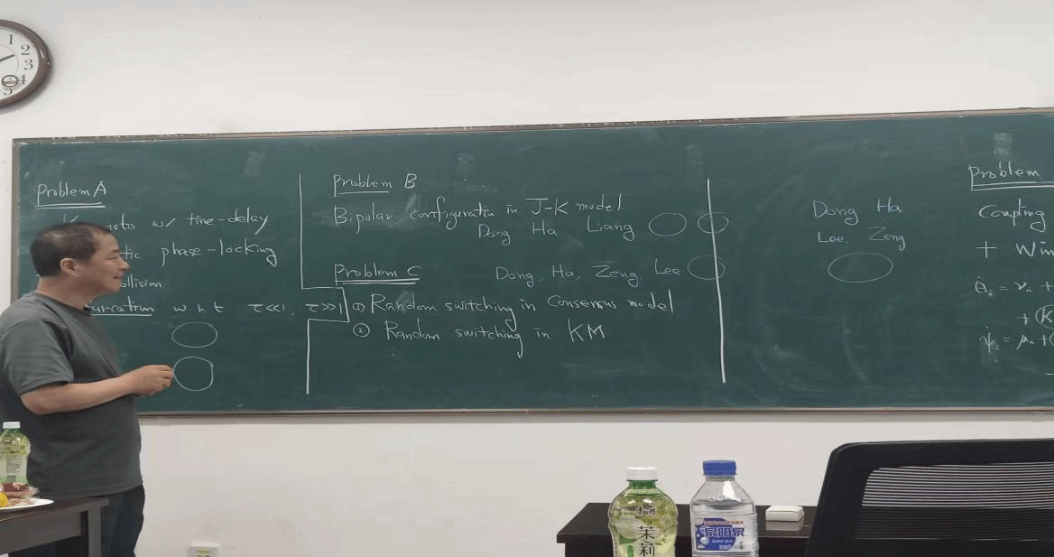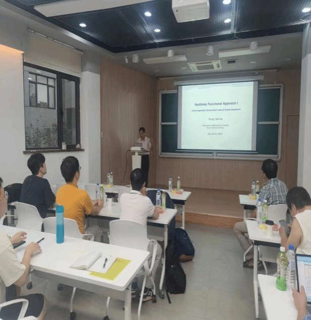 首场报告Ha教授利用非线性函数方法提出了从双曲平衡定律到动力学方程的统一时间稳定性主题。非线性函数方法最早由 James Glimm 在 1965 年关于双曲守恒定律的柯西问题的工作中提出,后来由 Tai-Ping Liu、Tong Yang、Alberto Bressan、Stephano Bianchini 等人进一步改进和推广,用于研究 Glimm 方案和前沿跟踪方案生成的熵弱解的统一时间 L^1 稳定性以及从粘性守恒定律到双曲守恒定律的消失粘性极限问题。在本场报告后,师生就感兴趣的问题与Ha教授进行了交流讨论,讨论了如何将这种非线性函数方法用于动力学方程(如玻尔兹曼方程和真空附近的 Vlasov 型方程)的统一稳定性。