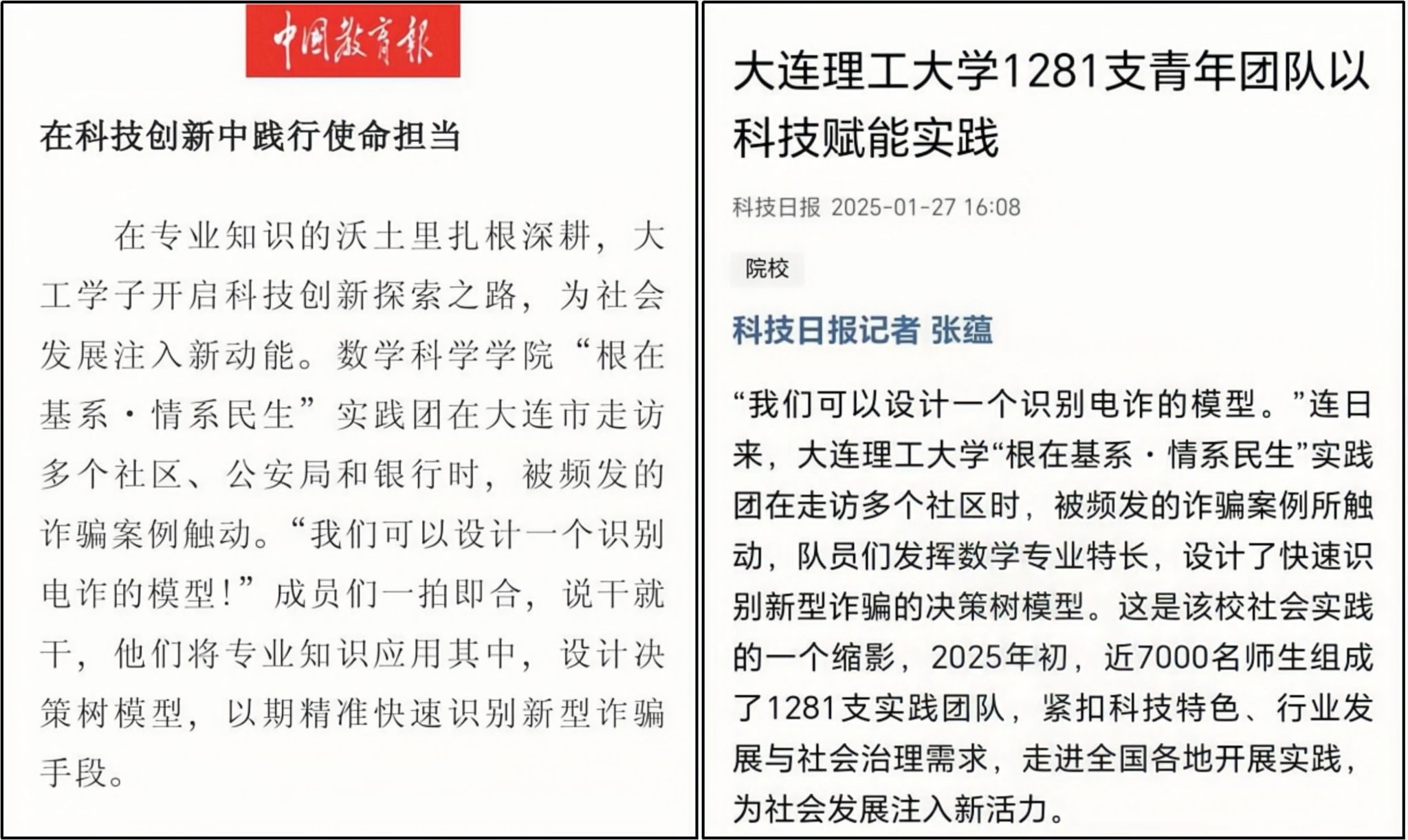 将科技创新与社会实践深度融合,让专业知识发挥专业作用。数学科学学院“根在基系,情系民生”寒假社会实践团在走访调研中被频发的电信诈骗案例触动,聚焦精准反诈防诈,充分发挥数学专业知识,设计出了快速识别诈骗的决策树模型,识别准确率达86%。通过技术创新和宣传讲解双管齐下,实践团为筑牢反诈防线,助力社会治理贡献大工青年力量。相关事迹经学校推介,受到中国教育报、科技日报的报道。