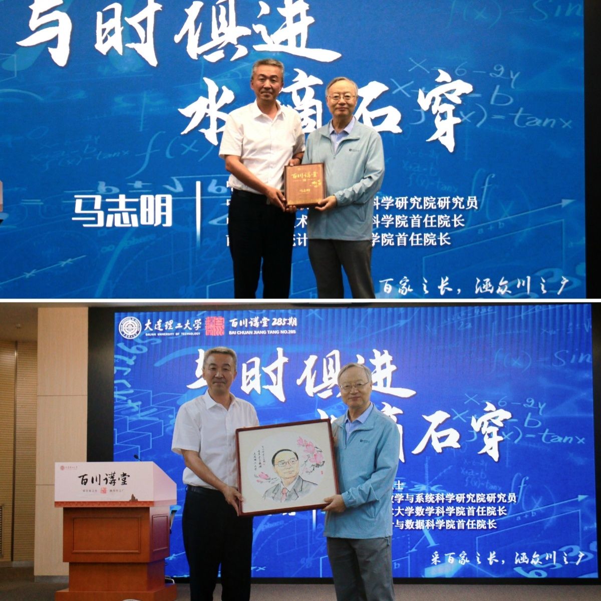 讲座最后,康旭东代表学校为马志明颁发“百川讲堂”纪念牌并赠送国画肖像,以表感谢与敬意。
