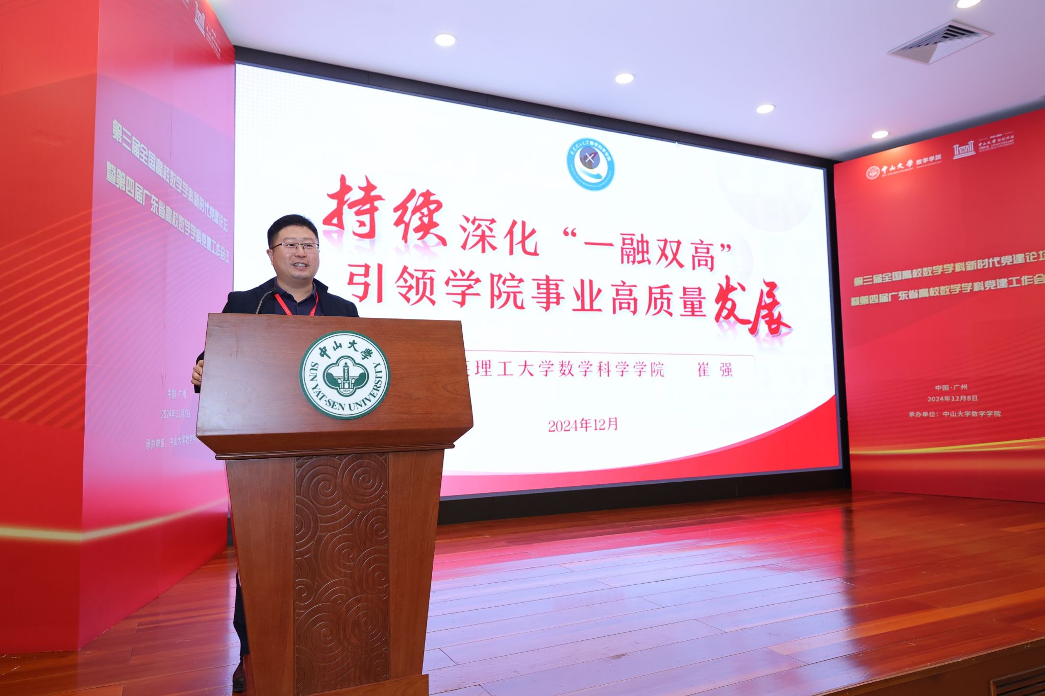 12月8日,第三届全国高校数学学科新时代党建论坛在中山大学举办。学院党委书记崔强带队,与党支部书记代表及学院工作人员参加了会议,并以《持续深化“一融双高”引领学院事业高质量发展》为题作大会报告。
