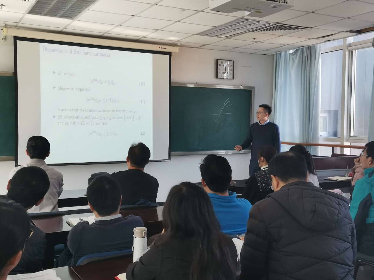 会上,衣凤岐、李俊峰两位老师先后介绍了自己的科研方向和研究兴趣,并对一些相关问题进行讨论和交流。衣凤岐老师先从无穷维动力系统的稳态分支和Hopf分支讲起,向大家介绍了该领域的研究进展,并简要介绍了他和合作者在该领域所开展的一些研究工作;随后,向大家介绍了分支理论在图灵斑图的形成机制研究及传染病传播问题研究中的具体应用。李俊峰老师介绍了他和他的合作者应用调和分析方法研究非线性色散方程、沿曲线的奇异积分理论以及色散算子点态收敛的Carleson问题的一些成果。通过这些结果的介绍,李老师阐述了调和分析中震荡积分估计在这些问题研究中的重要性。同时还阐释了研究过程中研究者的视角对于问题理解的重要意义。