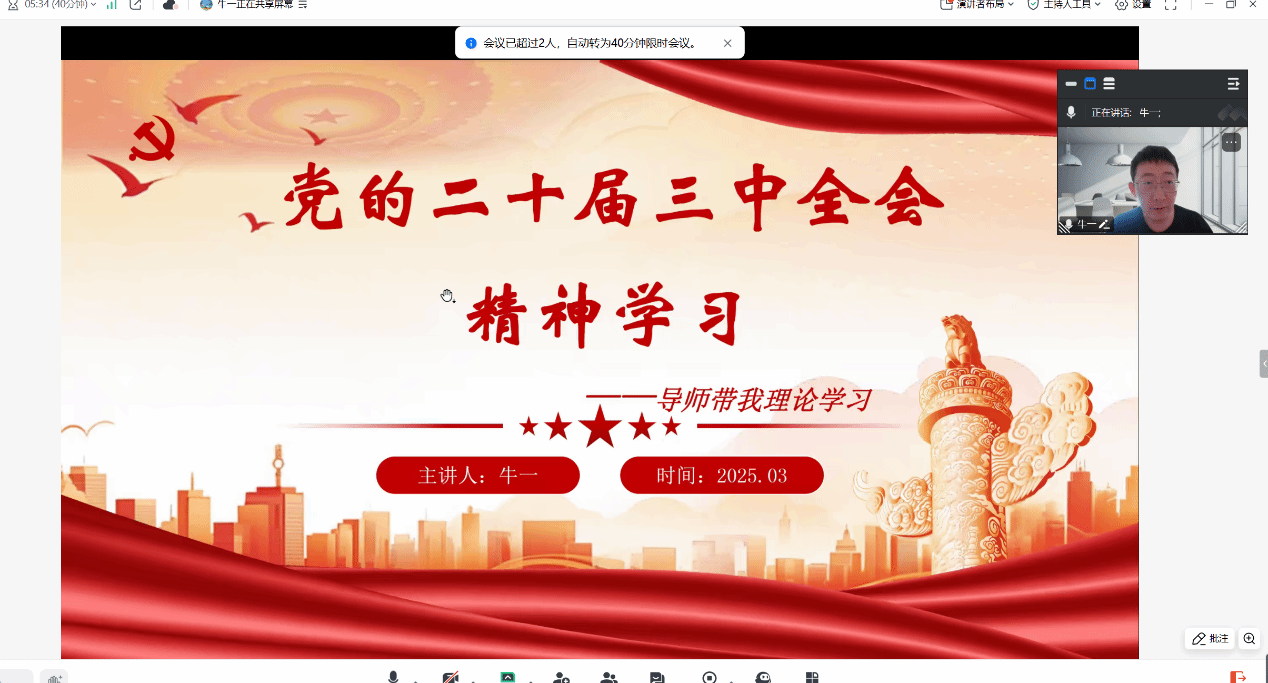 为深入学习党的二十届三中全会精神,应用统计硕士第二团支部于4月2日组织开展了“导师带我学理论”主题团日活动,邀请导师牛一老师进行专题讲解,活动取得良好效果。